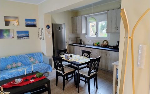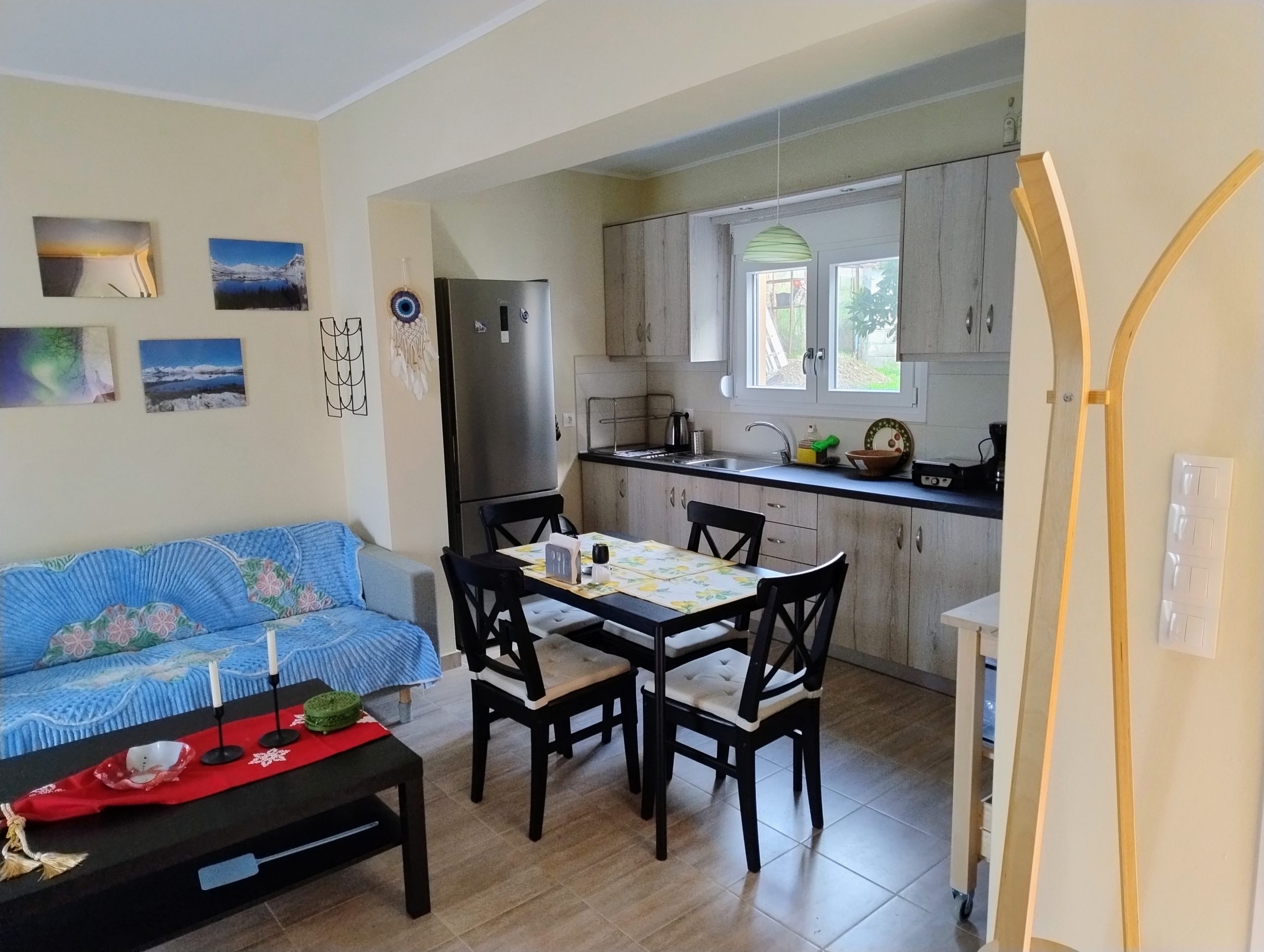 Voll ausgestattete Küche mit Kühlschrank, Tiefkühlschrank, Backofen, Abzugshaube und keramik Kochfeld.