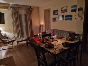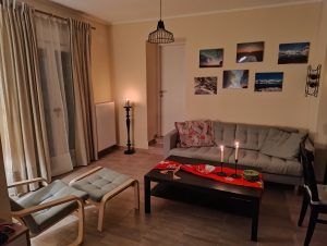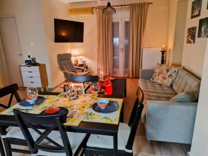 - Wohnzimmerbereich mit Sitzecke und TV (griechisches Fernsehen lokal und Sat-TV über ASTRA 19°)
